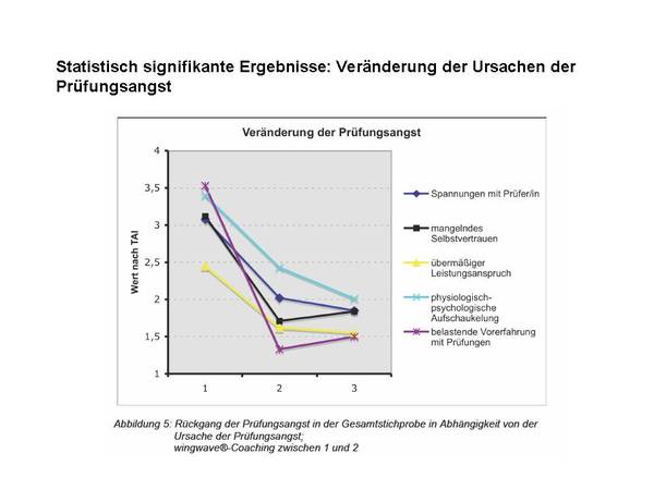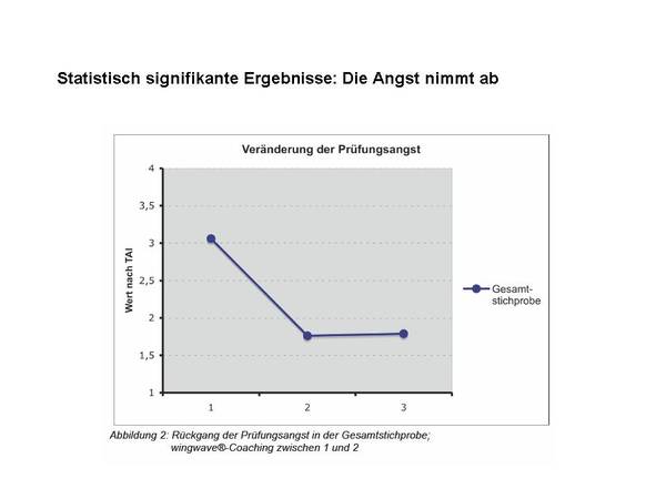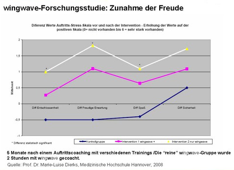 In allen drei Gruppen konnten die Teilnehmer ihr Lampenfieber reduzieren, wobei die pure Wingwave-Gruppe mit dem besten Ergebnis abschnitt. Erstaunlich war dann das Ergebnis der Nachbefragung ein halbes Jahr danach: Die große Stärke von Wingwave-Coaching scheint nicht nur in der Stress-Reduktion zu bestehen, sondern in der nachhaltigen Entfaltung von positiven Gefühlen und Zuständen wie Entschlossenheit, Spaß und sogar freudige Erwartung bei einem Auftritt vor fremdem Publikum.